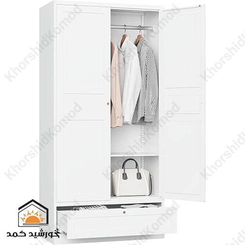 - فضای داخلی کاربردی: کمد پریسا دارای یک کشو و یک طبقه داخلی است. کشو به شما این امکان را میدهد که اقلام کوچکتر مانند لوازم جانبی، لباسهای زیر یا وسایل شخصی را به راحتی سازماندهی کنید. طبقه داخلی نیز فضای مناسبی برای قرار دادن لباسها، کیفها یا کفشها فراهم میآورد.