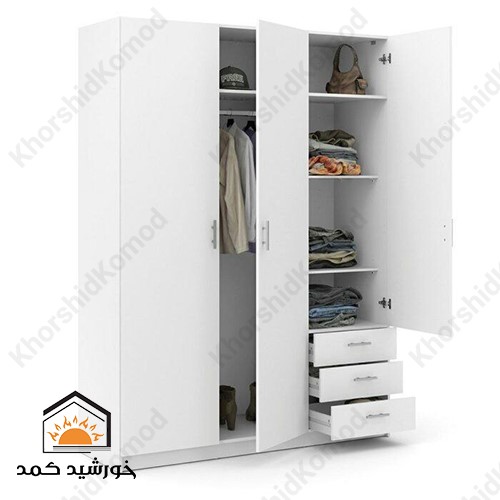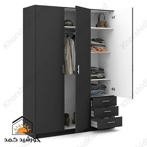 3. سه کشو کاربردی: علاوه بر فضای داخلی کمد، این مدل دارای سه کشو نیز می‌باشد که برای نگهداری وسایل کوچک‌تر مانند لباس‌های زیر، لوازم جانبی و سایر اقلام شخصی بسیار مناسب است. کشوها به راحتی باز و بسته می‌شوند و به شما کمک می‌کنند تا وسایل خود را به خوبی سازماندهی کنید.